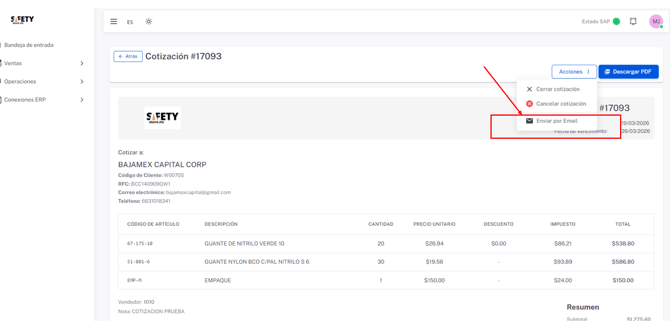 2. La cotización se envía al cliente por correo electrónico directamente desde Tripulse.