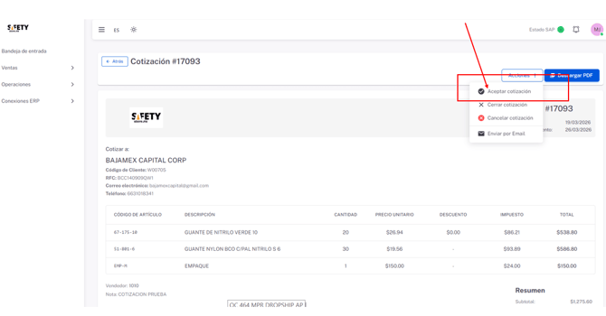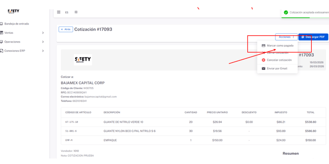 b. Abrir la cotización y dar clic en el menú de acciones para seleccionar la opción “Marcar como pagada”. De esta manera, la oferta de venta se convertirá en una orden de venta en el sistema SAP, lo que permitirá que el área de Almacén pueda proceder con la remisión.