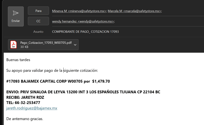 5. Se manda por correo comprobante de pago y datos de envio a equipo CyC para su validación de pago.