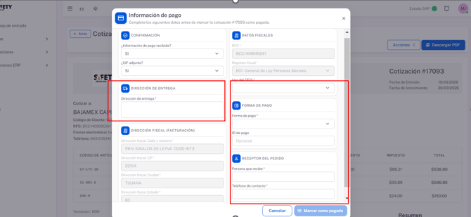 6. Una vez que el pago esté confirmado, el equipo Mine ingresará al portal de Tripulse y marcará la cotización como pagada, para que esta se convierta en orden de venta en SAP y el área de almacén pueda proceder con la remisión.